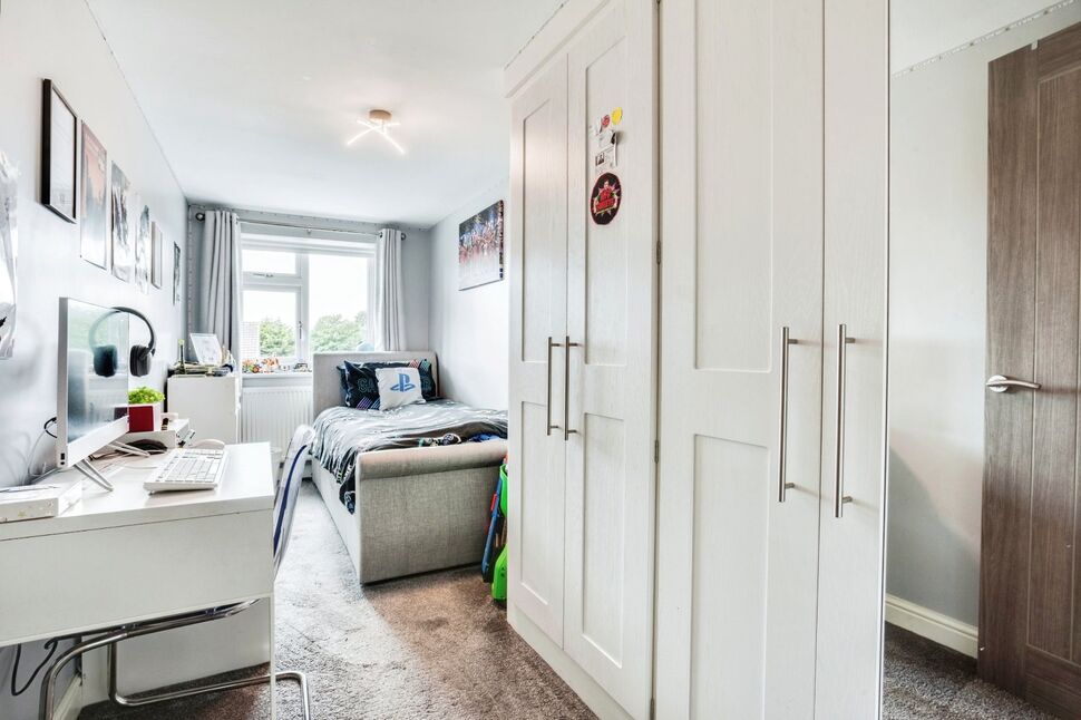 Bedroom with fitted wardrobes, carpeted floor, gas central heating radiator and uPVC double glazed window to the front elevation.