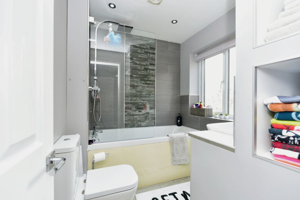 The bathroom is a stylish space complete with a white bathtub, low flush W.C., wash hand basin, and a shower over the bath