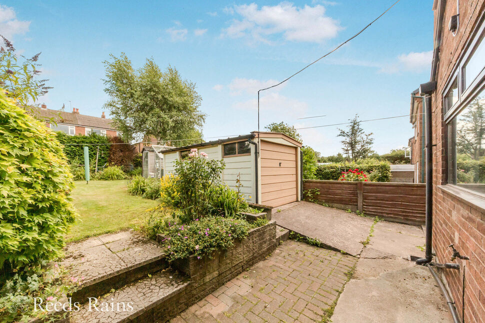 To the front there is a lawned garden with borders, and a driveway which runs alongside the property to the DETACHED GARAGE. The lovely rear garden is lawned with well stocked borders, two patio areas, one being at the end of the garden. Timber shed. Greenhouse. Cold water tap. Gas meter cupboard. Outside sensor security lights.