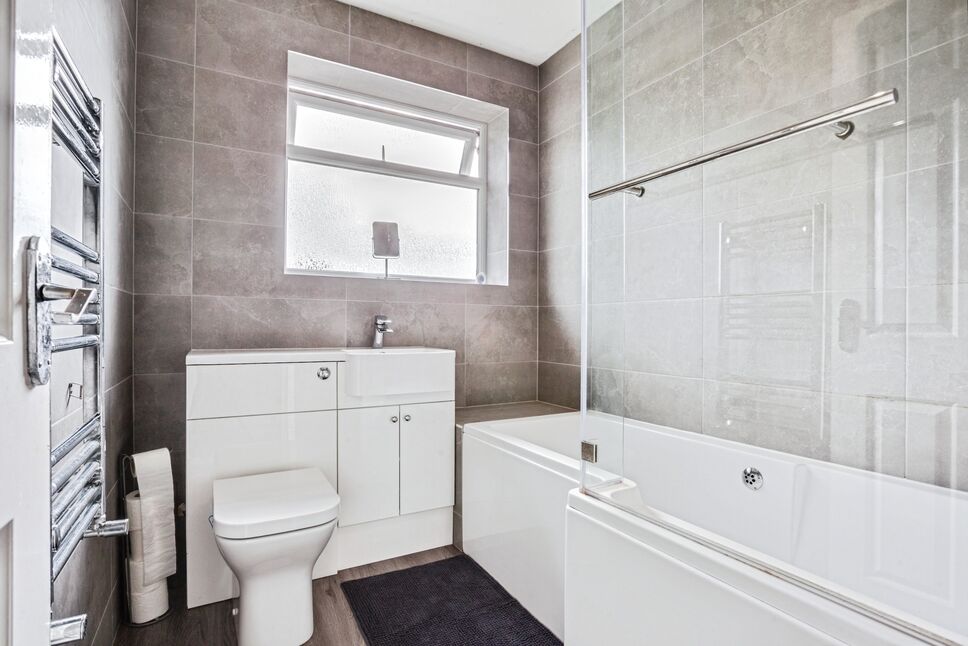 Modern white suite comprising rectangular panelled bath, with glazed shower screen, vanity wash basin, WC, tiled walls, chrome towel rail/radiator, tiled floor.