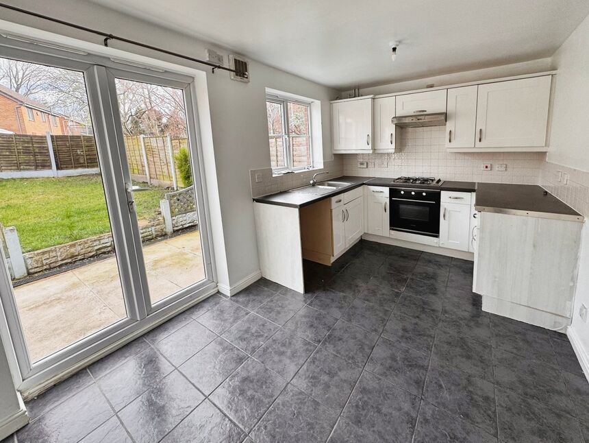 Double glazed window to rear, double glazed patio doors to rear, matching wall and base units with work surfaces over, stainless sink unit with mixer taps over, integrated hob and oven, space for fridge/freezer, space for washing machine, radiator and laminate flooring.