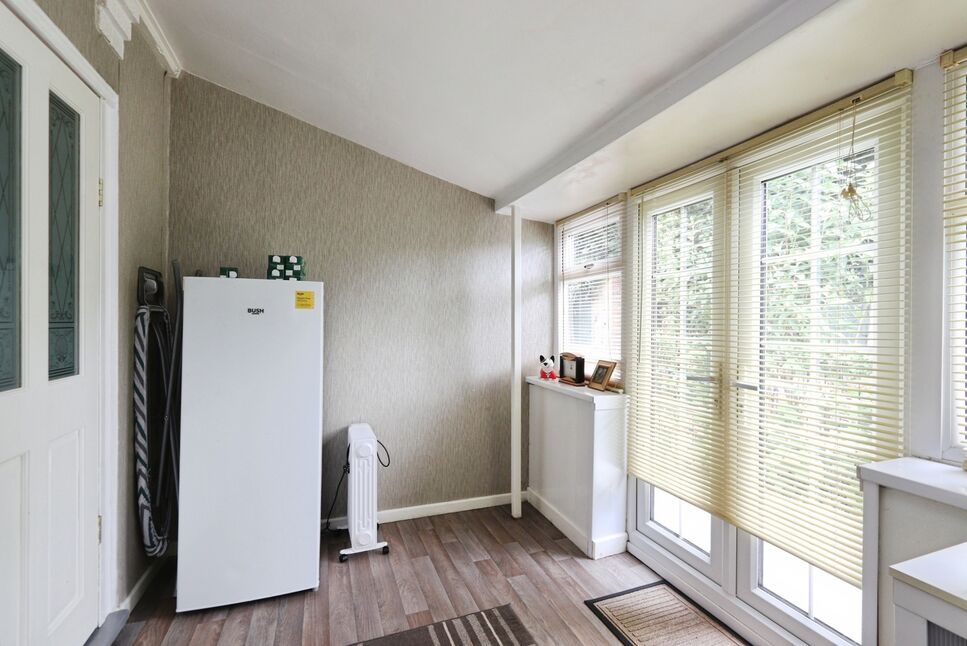 Wood floor covering, central heating radiator, built in understairs storage cupboard and double doors providing access to the conservatory.