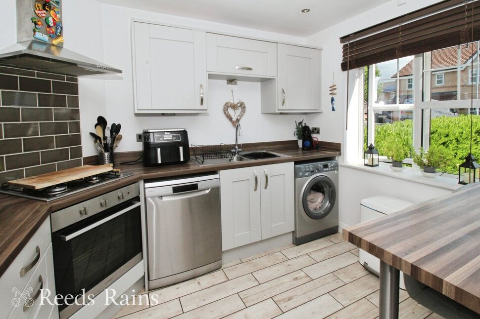 Front facing double glazed window. Range of wall and base units with worktop surfaces, breakfast bar and stainless steel one and a half bowl sink unit with mixer tap. Integrated electric oven and four ring gas hob with extractor hood over. Integrated fridge freezer, plumbed for washing machine and dishwasher. Part tiled walls and tiled floor. Radiator.