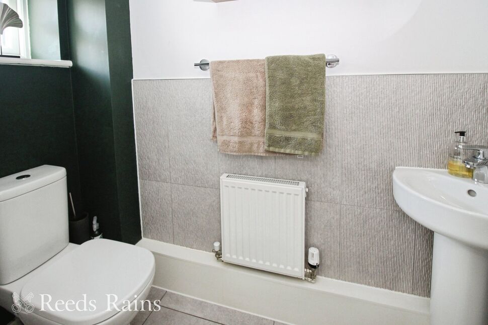 Front facing double glazed window. Two piece suite comprising hand basin and WC. Part tiled walls and tiled floor. Radiator. Extractor fan.