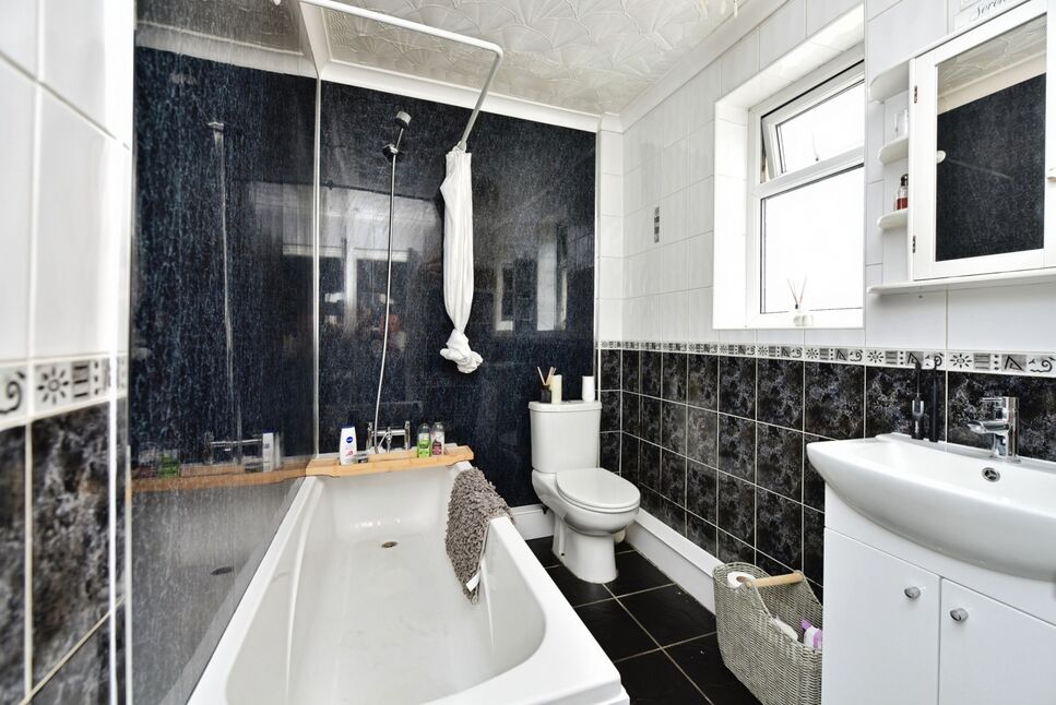 The downstairs bathroom is fully tiled and fitted with a wc, wash hand basin, a central heating radiator, bath with shower over and two side facing PVCu double glazed windows.