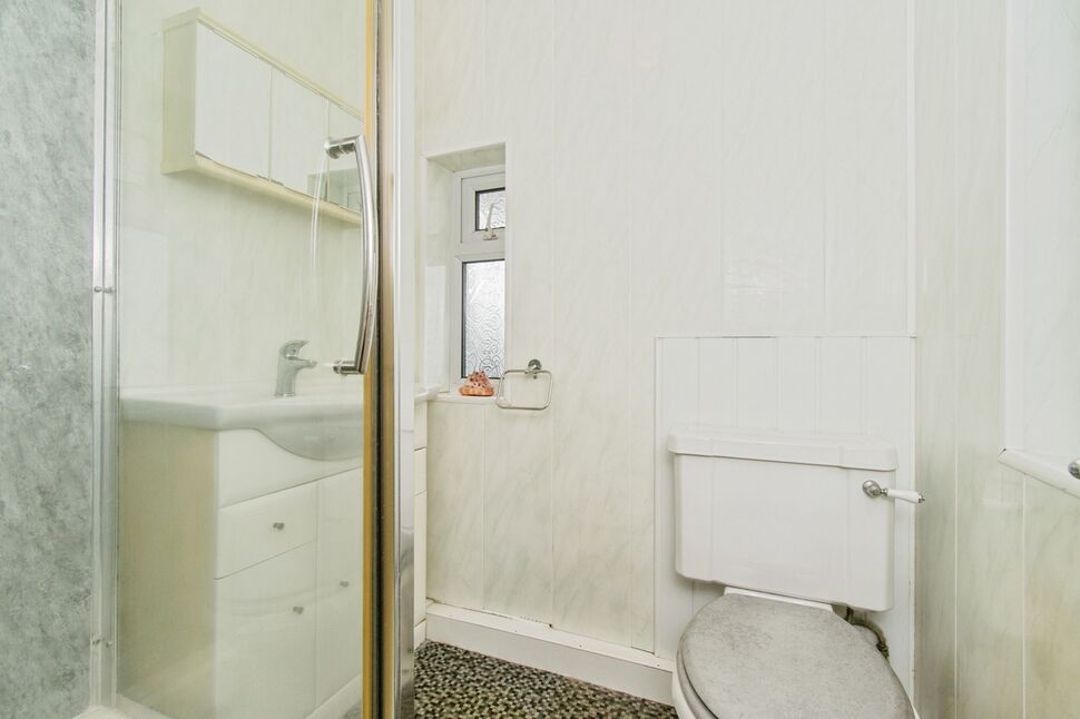 Comprises of a low level WC, a vanity wash basin with a chrome effect mixer tap inset and a shower cubicle with an electric shower over. Tiled walls, a central heating radiator and windows overlook the side and rear aspects.