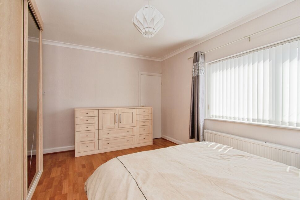 Fitted sliding wardrobes, laminate flooring, a storage cupboard, a central heating radiator and a window overlooks the front aspect.