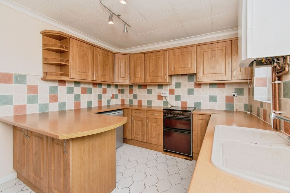 Fitted with a range of wall and base units, a roll edge work surface with matching breakfast bar, tiled splash backs and a single bowl sink with a chrome effect mixer tap inset. Plumbing for a washing machine, spaces for single height fridge and freezers, a central heating radiator and two windows overlooks the rear aspect. A door leads to the rear entrance.
