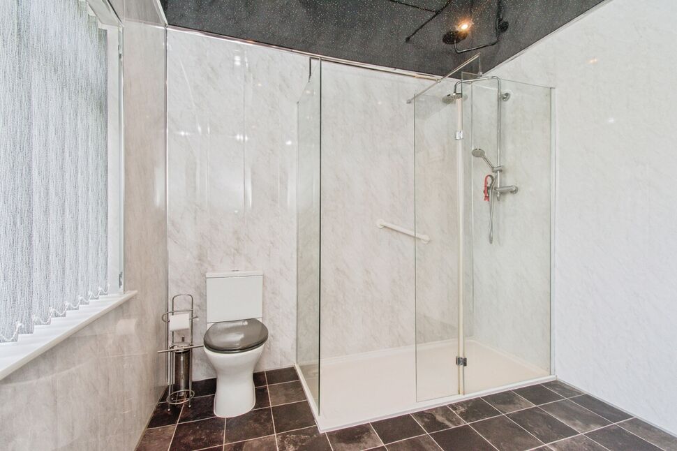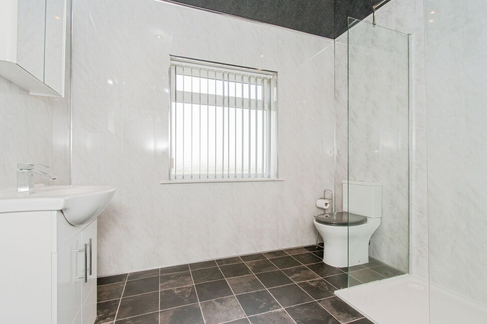Comprises of a low level WC, a vanity wash basin with a chrome effect mixer tap inset and a shower cubicle with a chrome effect mains shower over. Easy wipe panelled walls, spotlights, a chrome effect heated towel rail and a window overlooks the rear aspect.
