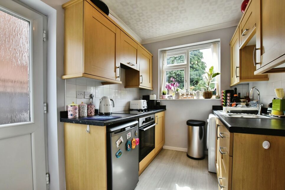 A well presented kitchen features base and wall units with a work surface over, stainless steel sink with a drainer unit and mixer tap, integrated oven, space for a fridge, space for a washing machine, uPVC double glazed window to the rear elevation, radiator and a uPVC double glazed door leading to the outside.