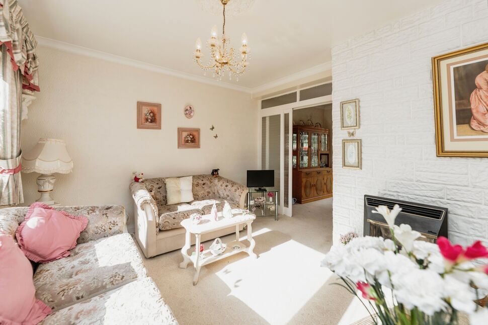 Wall mounted fire, coving to ceiling, central heating radiator and double glazed window overlooking the front elevation. Sliding doors to:-