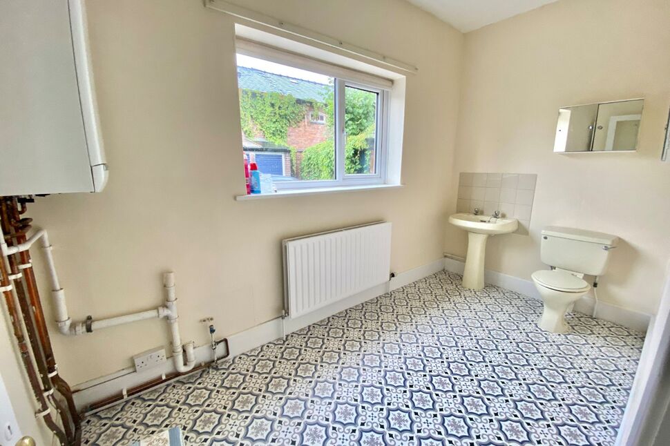 With wash hand basin, recess for washing machine, Baxi GCH boiler system, WC. Part tiled walls, window to the rear.