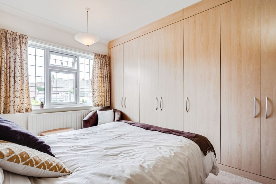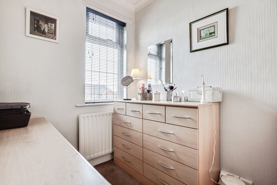 Double bedroom having a range of fitted wardrobes, central heating radiator and front facing window.