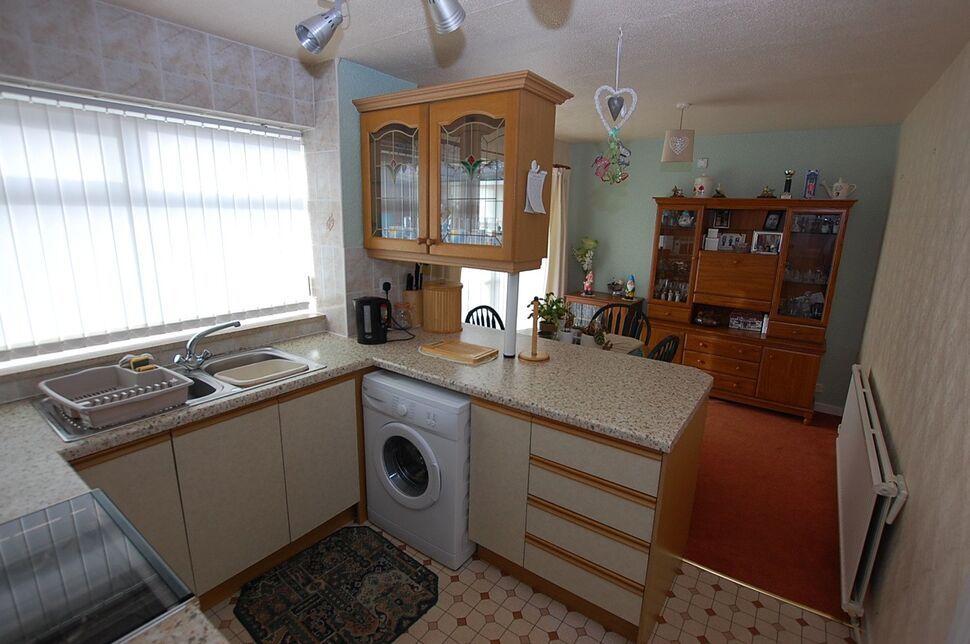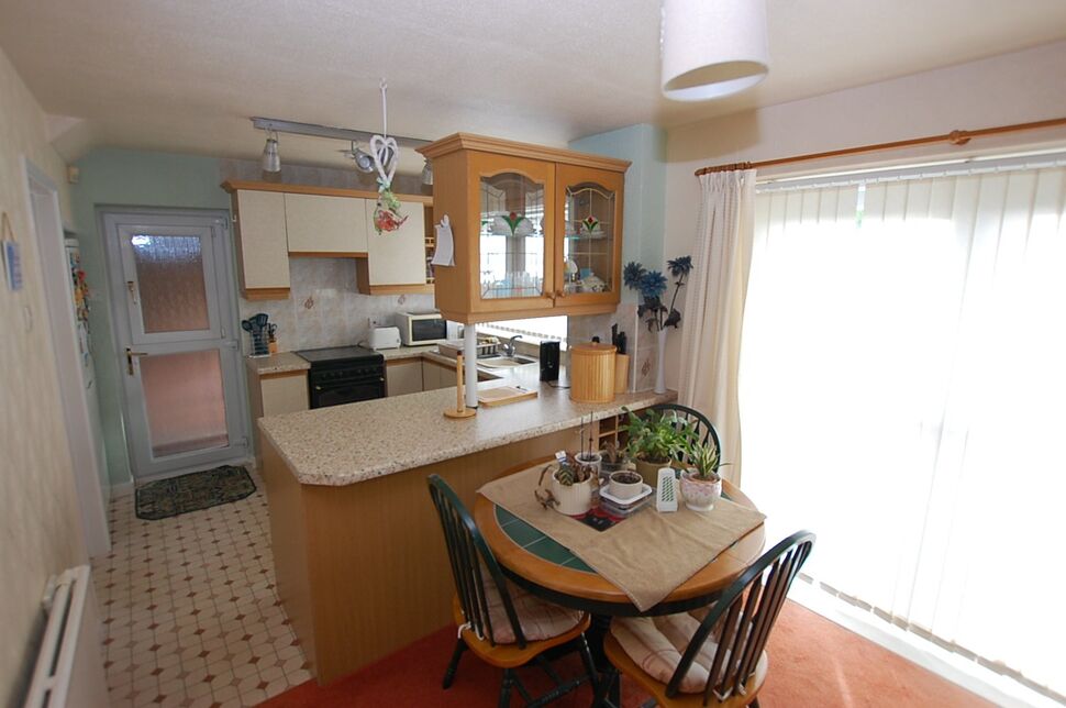 Fitted with a range of wooden base units and wall mounted storage cupboards complemented by laminated worktops, stainless steel one and a half bowl sink and drainer with mixer tap over, combi cooker with extractor hood over, space for washing machine, understairs cupboard, radiator, UPVC French doors to rear aspect, radiator.