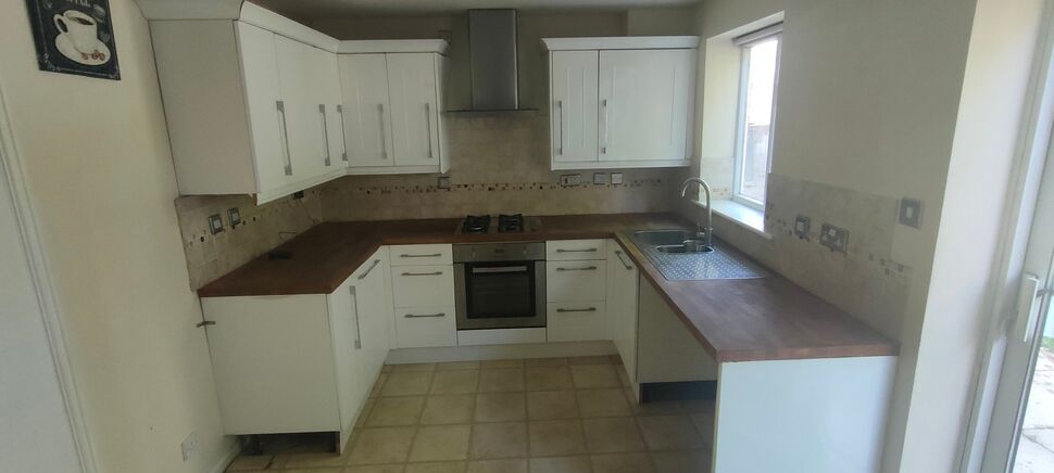 The kitchen fitted with a range of Shaker style base and wall mounted kitchen units with wood block effect work surfaces and tiled splashbacks. Built in electric oven with four burner gas hob over, housed under a stainless steel, illuminating extractor hood. Stainless steel one and a half sink, drainer and mixer tap under a hardwood framed double glazed window over the rear garden. Space and plumbing for a washing machine, tumble dryer or dishwasher and tall fridge/freezer. Tile effect floor covering. Ceiling light point.The dining area has an under stairs storage cupboard and UPVC double glazed sliding doors to the rear patio. Continuation of the tile effect floor covering. Radiator.