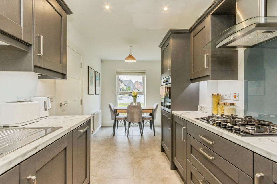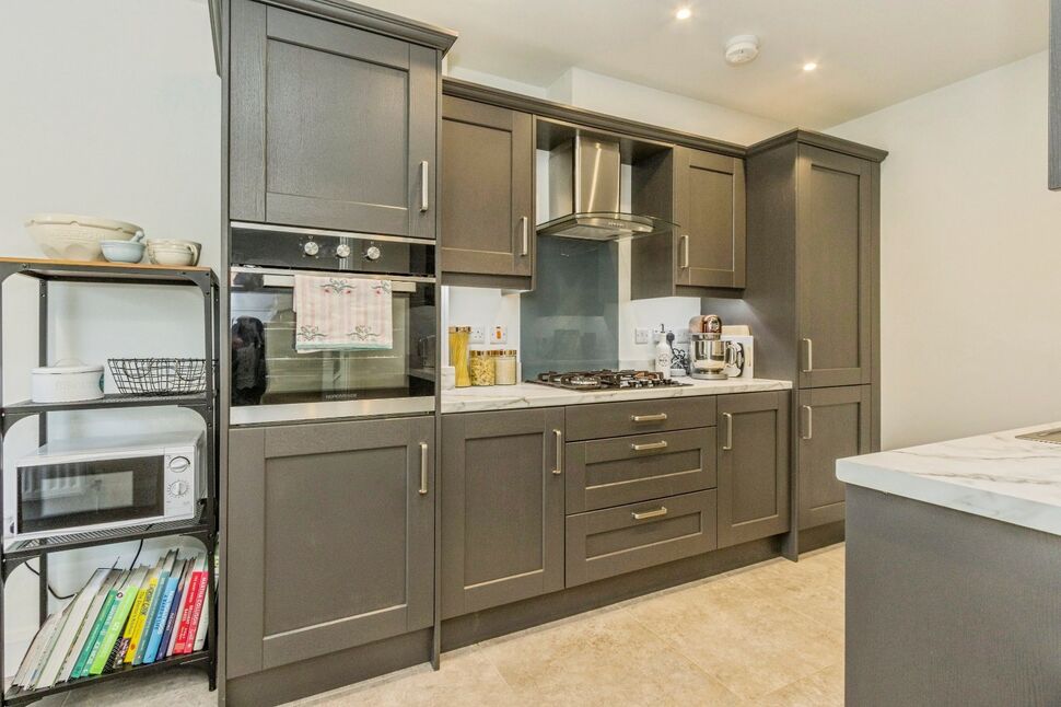 Exceptional fitted range of high and low level units, laminate work tops, built-in sink unit, gas hob and electric oven, fridge/ freezer, tiled flooring, open to casual dining