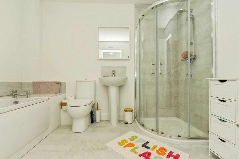 A deluxe white suite comprising panelled bath, wash hand basin, low level WC, separate shower cubicle, wall and floor tiling.