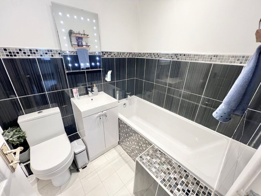 A modern three piece suite comprising of low-level WC with button flush, hand wash basin with under cabinet storage and chrome mixer tap, panelled bath with designer chrome mixer tap and showerhead, heated towel rail, illuminated vanity mirror, ceiling down spotlighting and extractor finished with tasteful ceramic wall and floor tiling.
