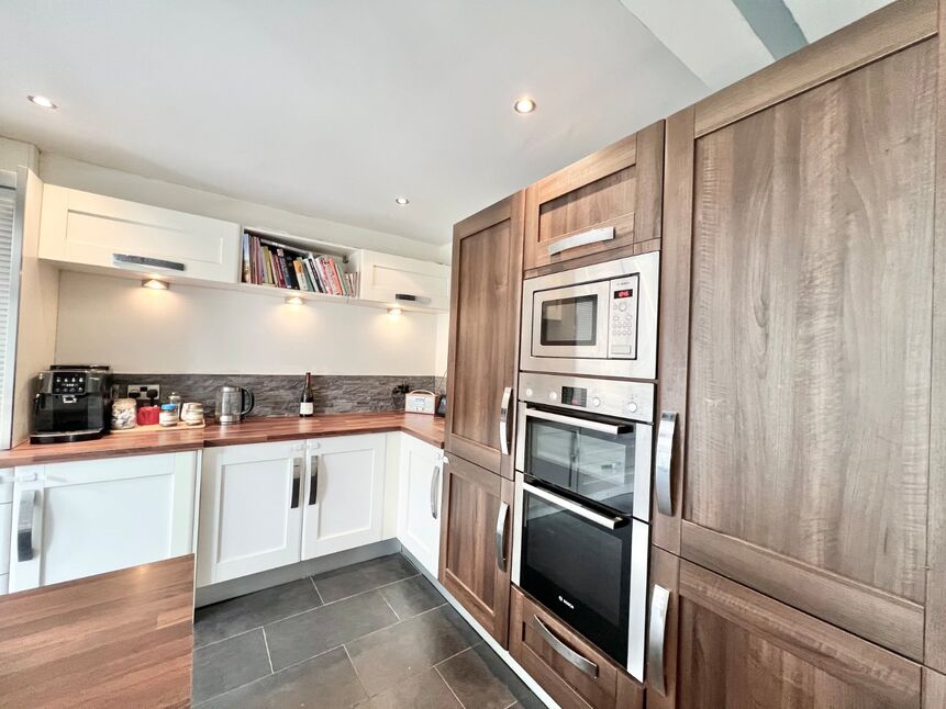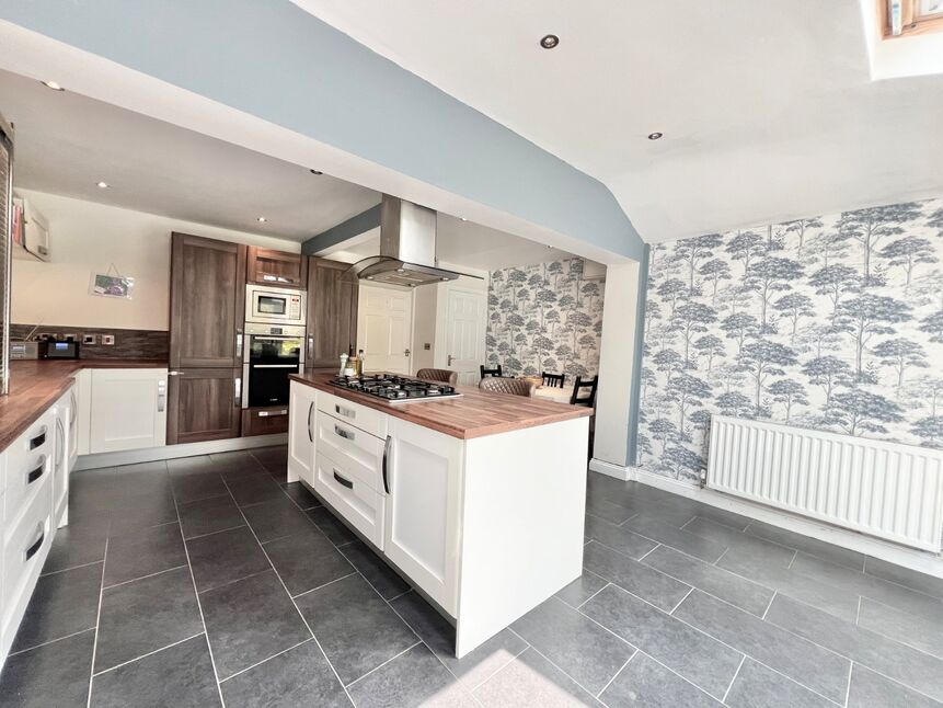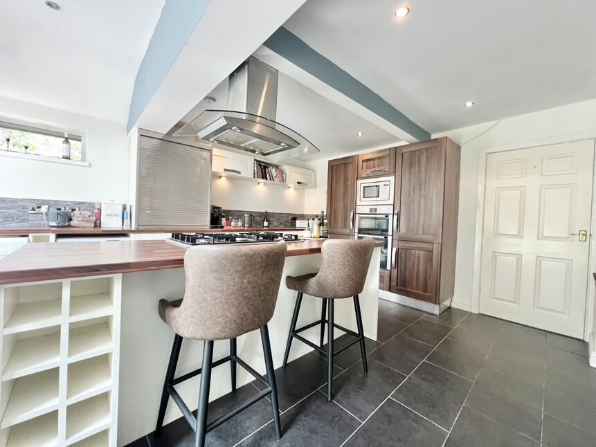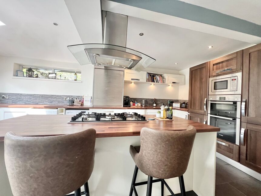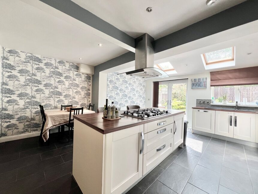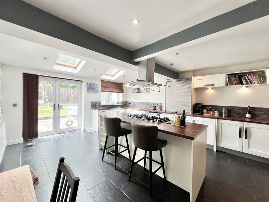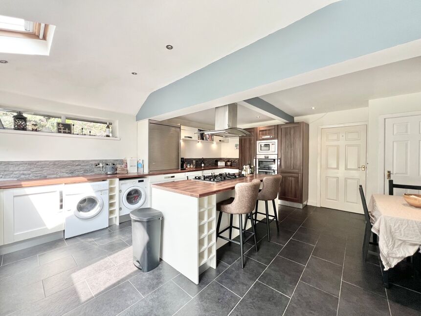 Fully fitted and very spacious (within extension) open plan family dining kitchen with an ample range of wall and base cabinets with contrasting work surfaces and splashback tiling.Integrated appliances include Bosch microwave oven with matching stainless steel fan assisted oven and grill, five burner Bosch gas hob with overhead extractor canopy, and integrated automatic dishwasher, plumbing is in place for both automatic washing machine and tumble dryer.Large centre kitchen Island with three seater breakfast bar, ample light from the UPVC double glazed windows and velux windows plus French doors leading out into the private rear garden.Neutral decor ceiling down spotlighting and slate grey ceramic floor tiling and useful under stairs storage cupboard.