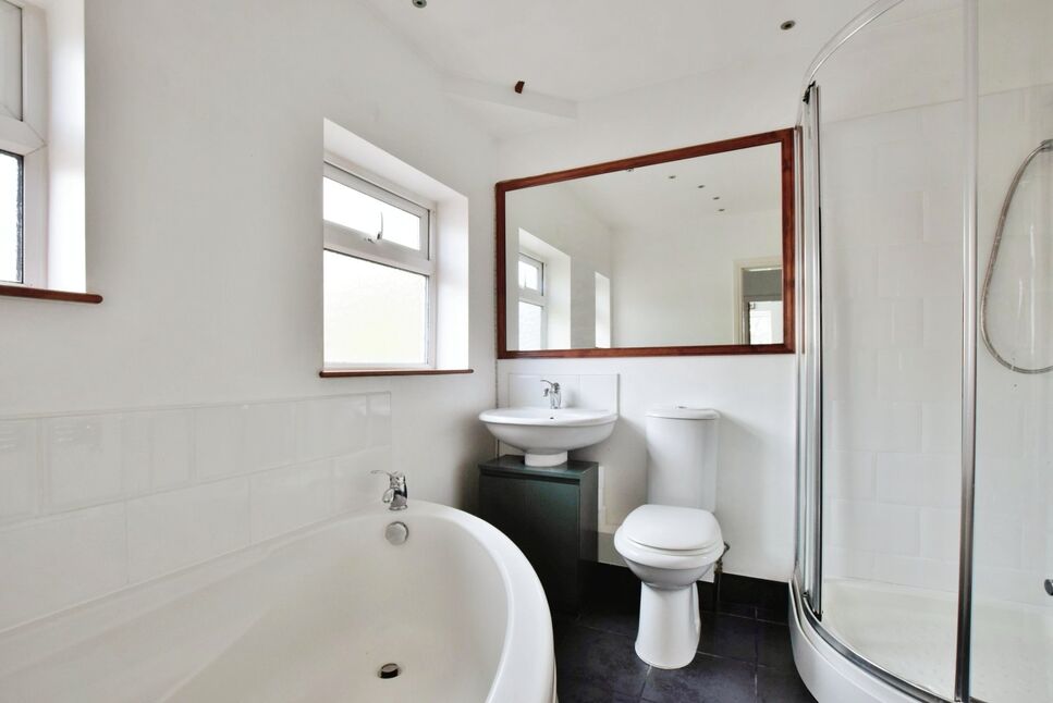 The bathroom is a modern yet cosy space with neutral décor and white tiles. A corner bath has a curved design with a chrome mixer tap. A free standing shower cubicle and low level WC. Tiled flooring, part tiled walls and two double glazed uPVC opaque windows to the side elevation.