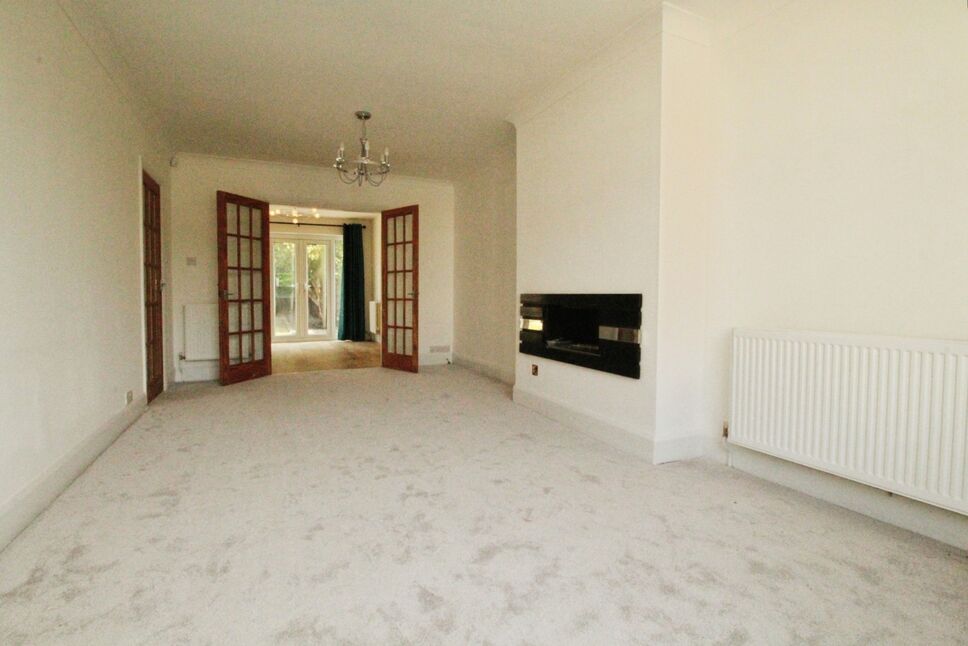 Front facing double glazed bay window, radiator, neutral décor, feature fireplace with electric fire, double doors with access to the dining room.