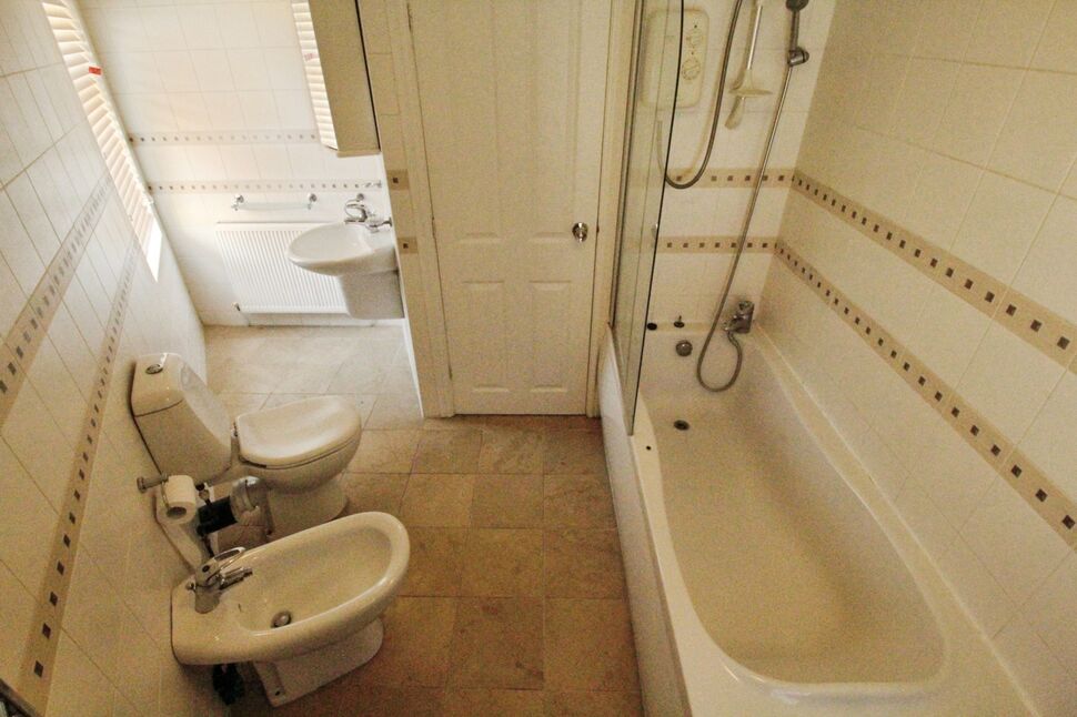 Front & side facing double glazed frosted windows, radiator, neutral décor, modern four piece suite in white comprising of Wc, pedestal hand basin, bidet and panelled bathtub with wall mounted shower, tiled walls and flooring.